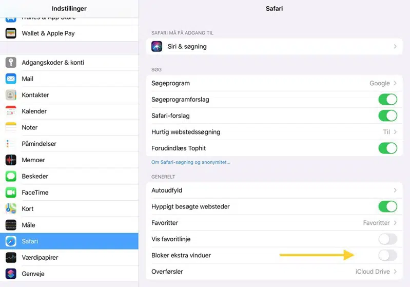 Dette kan ændres enkelt ved at gå ind i "indstillinger" > Find appen "Safari" > fjern markeringen ved "Bloker ekstra vindue".